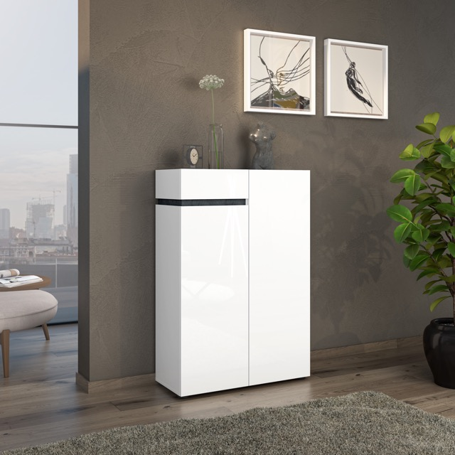 The glossy lacquered finish enhances the geometry of the design and brings brightness into the space. A recessed black groove, made from the same stone-effect material as the top, serves as both a handle and a defining visual element—adding character and depth with refined boldness. A contemporary look designed to adapt naturally to modern interiors, combining formal simplicity with everyday functionality.