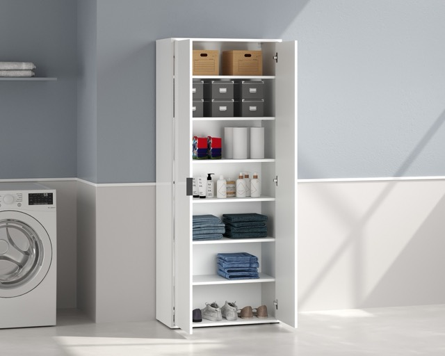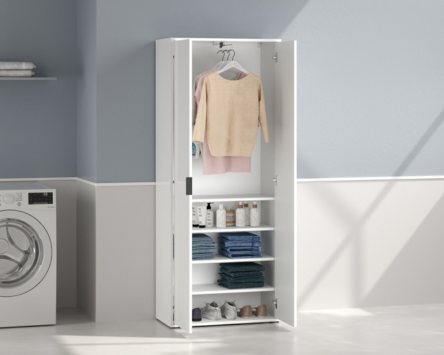 An essential collection designed to deliver immediate functionality with a clean, modern aesthetic. Vivo stands out for its versatility and an excellent balance of quality, practicality, and value, always maintaining a polished and cohesive look. Simple lines, a glossy white finish, and minimalist contrasting handles define an understated image suitable for any environment. These cabinets are designed with multifunctionality in mind: thanks to various internal configurations, they easily adapt to different needs—from utility and laundry storage to everyday organization. An ideal collection for those seeking smart, accessible solutions that organize space with effortless ease and understated elegance.
